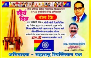 “शौर्य दिनानिमित्त भीमसैनिकांसाठी मोठी बातमी: भीमा कोरेगावला जाणाऱ्या वाहनांना ३१ डिसेंबर ते २ जानेवारीपर्यंत ‘टोल माफी’; महाराष्ट्र रिपब्लिकन पक्षाचे संस्थापक अध्यक्ष आयु.संजयभैया सोनवणे यांचा पुढाकार”